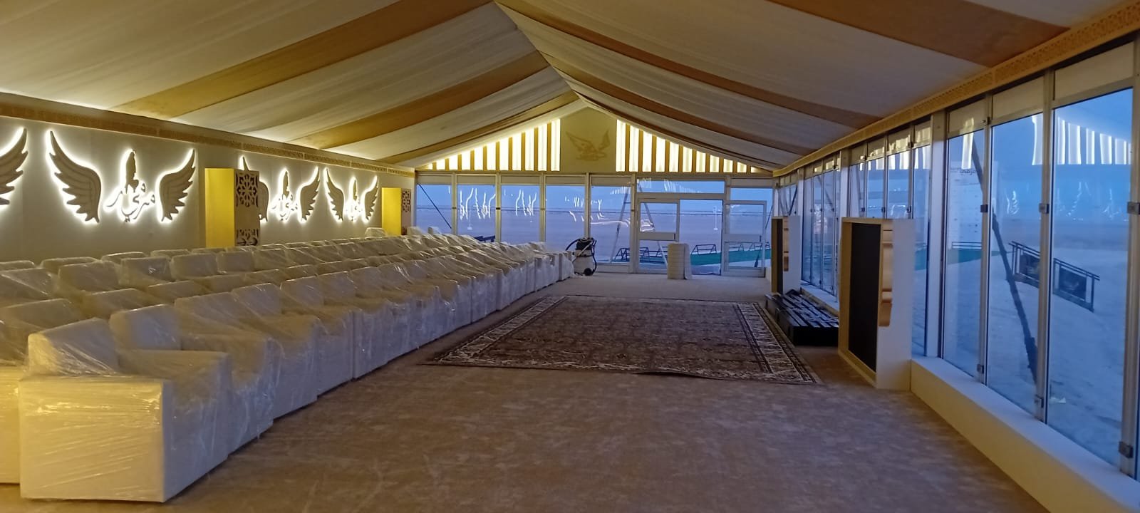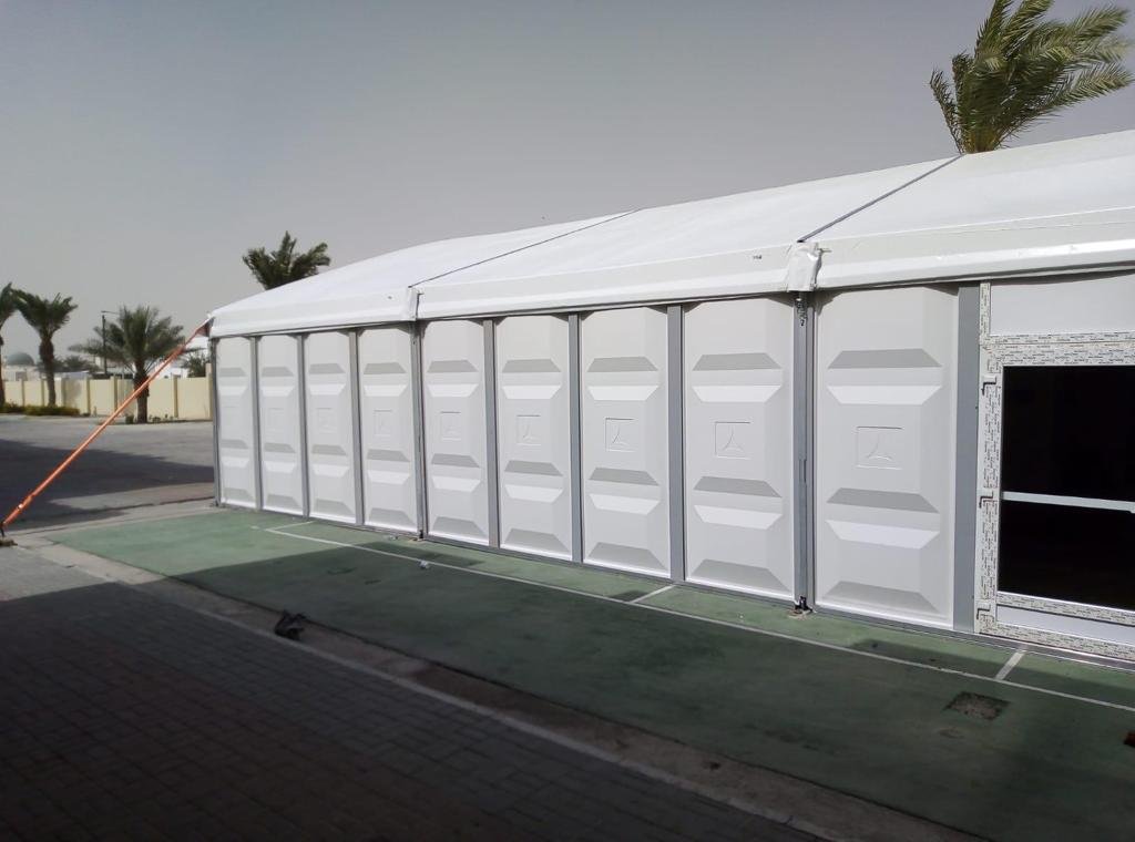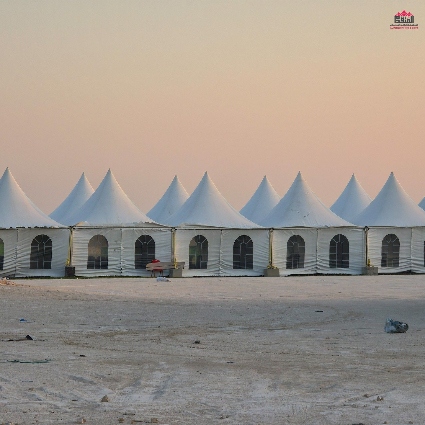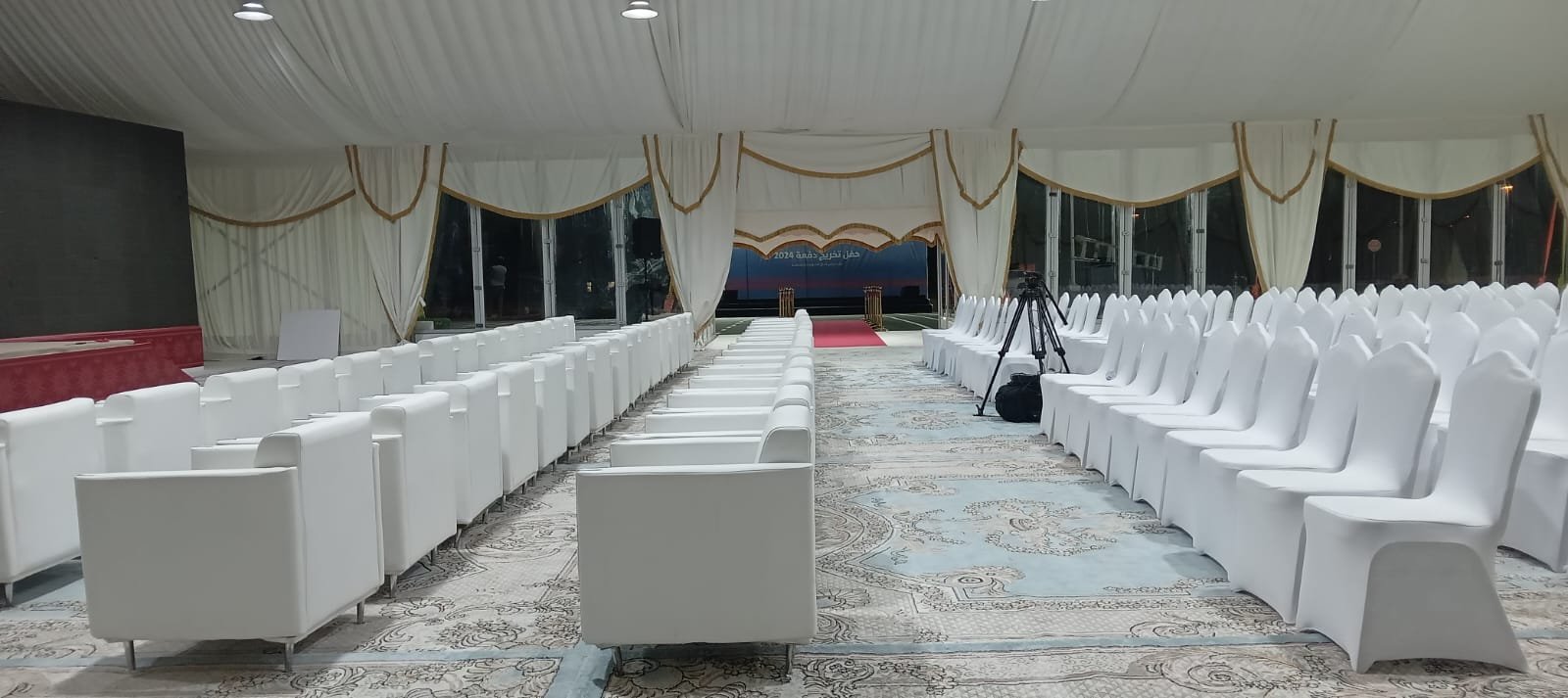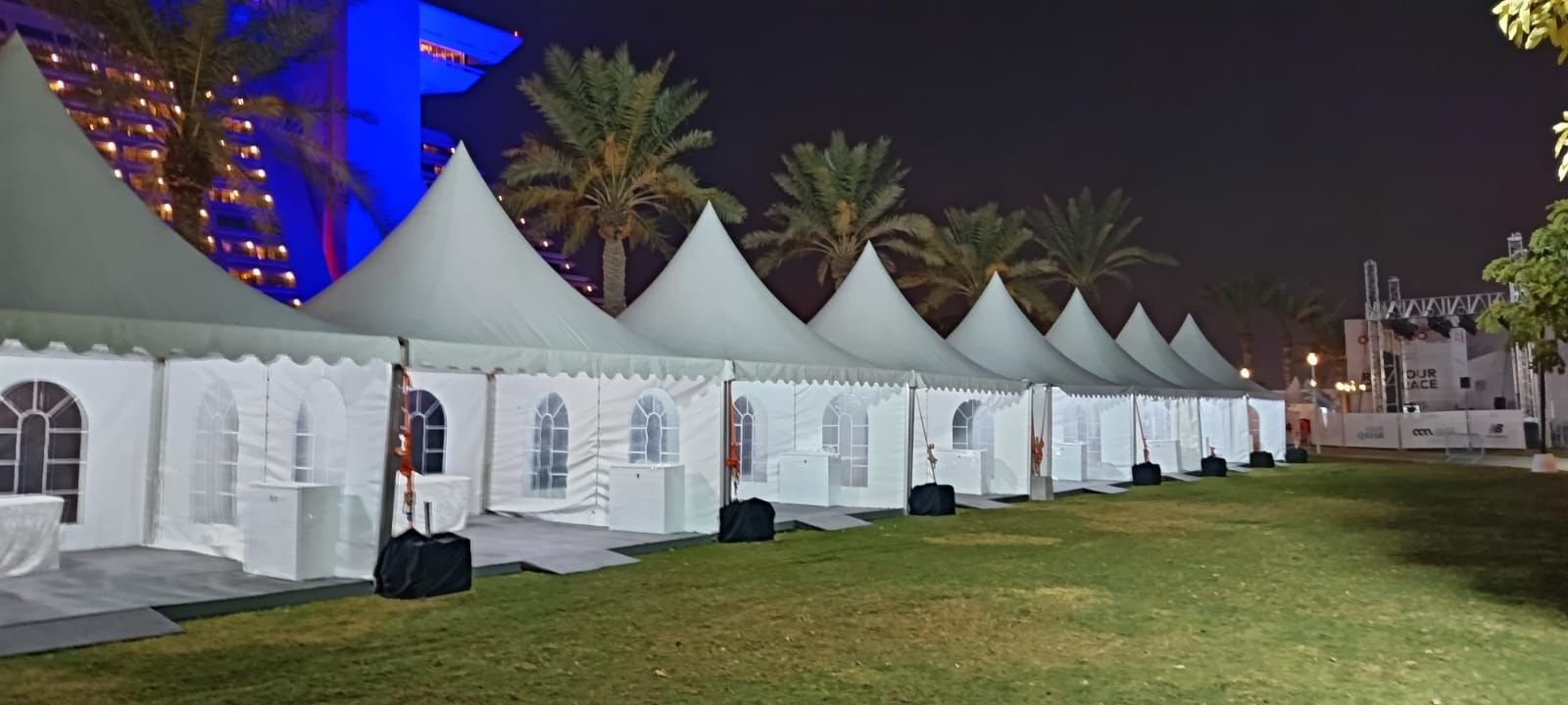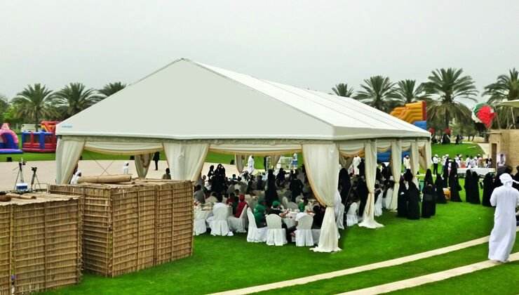 نوفر الخيام والقاعات المؤقتة مع الطاولات والكراسي وأنظمة الصوت والإضاءة.