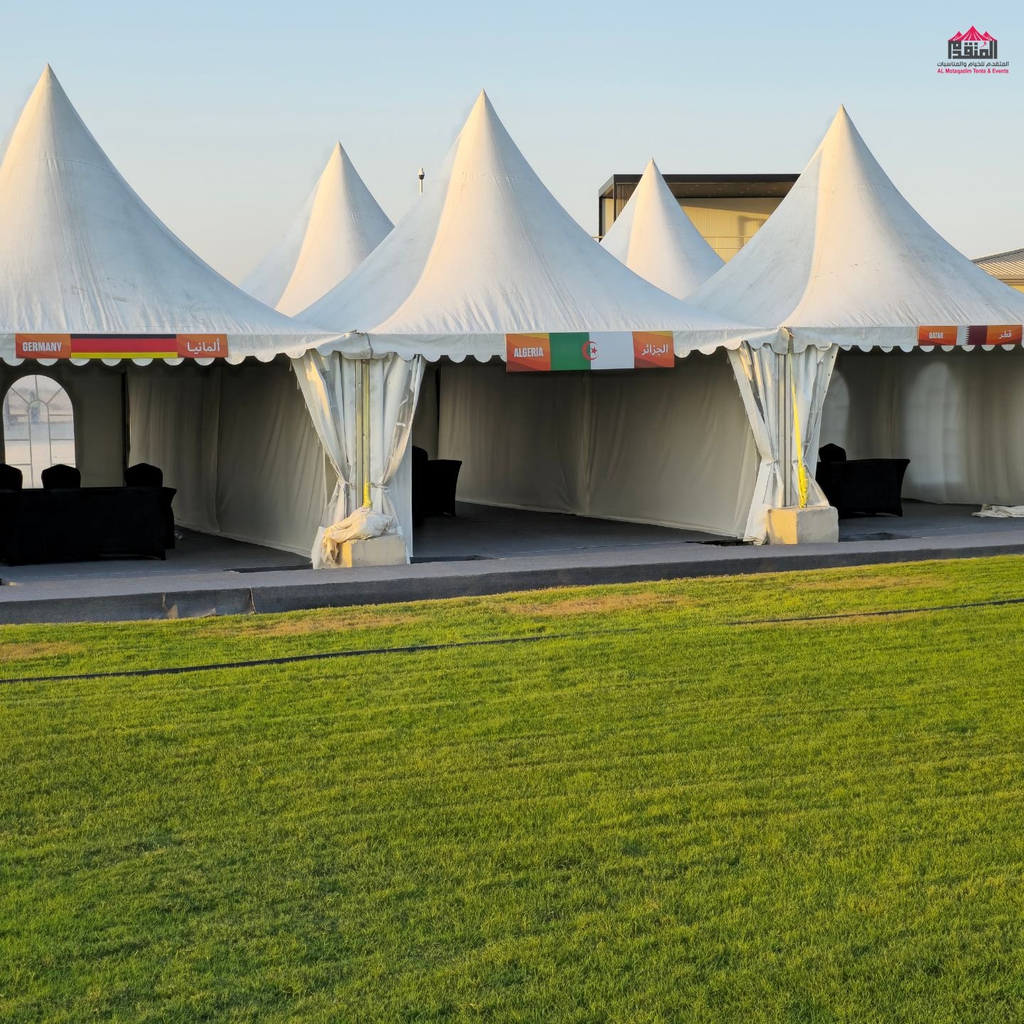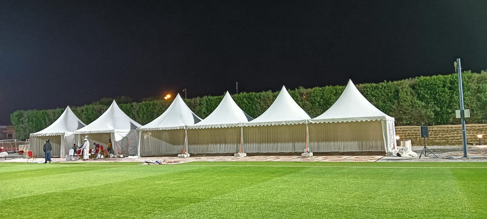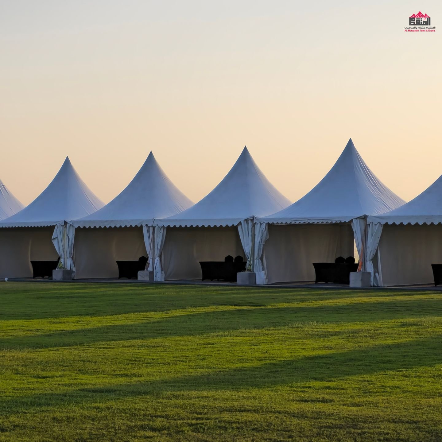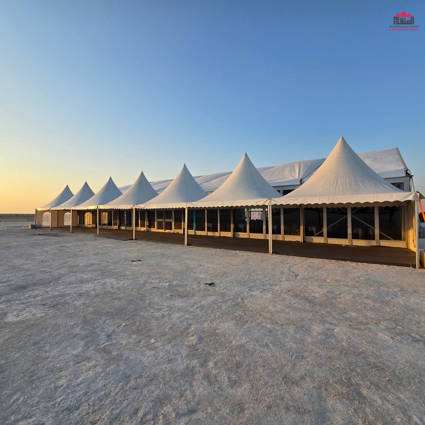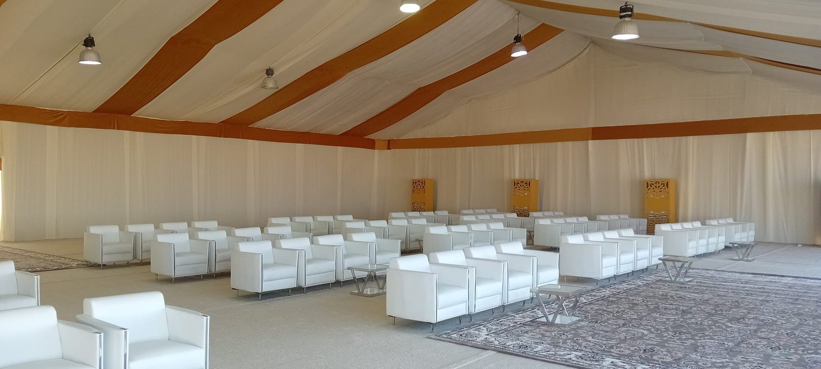 نوفر الخيام والقاعات المؤقتة مع الطاولات والكراسي وأنظمة الصوت والإضاءة.