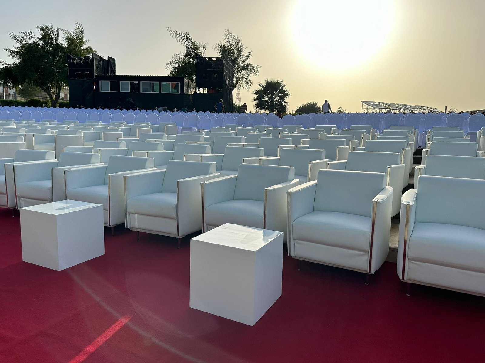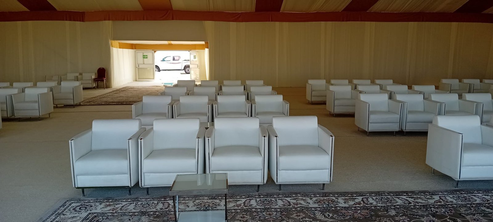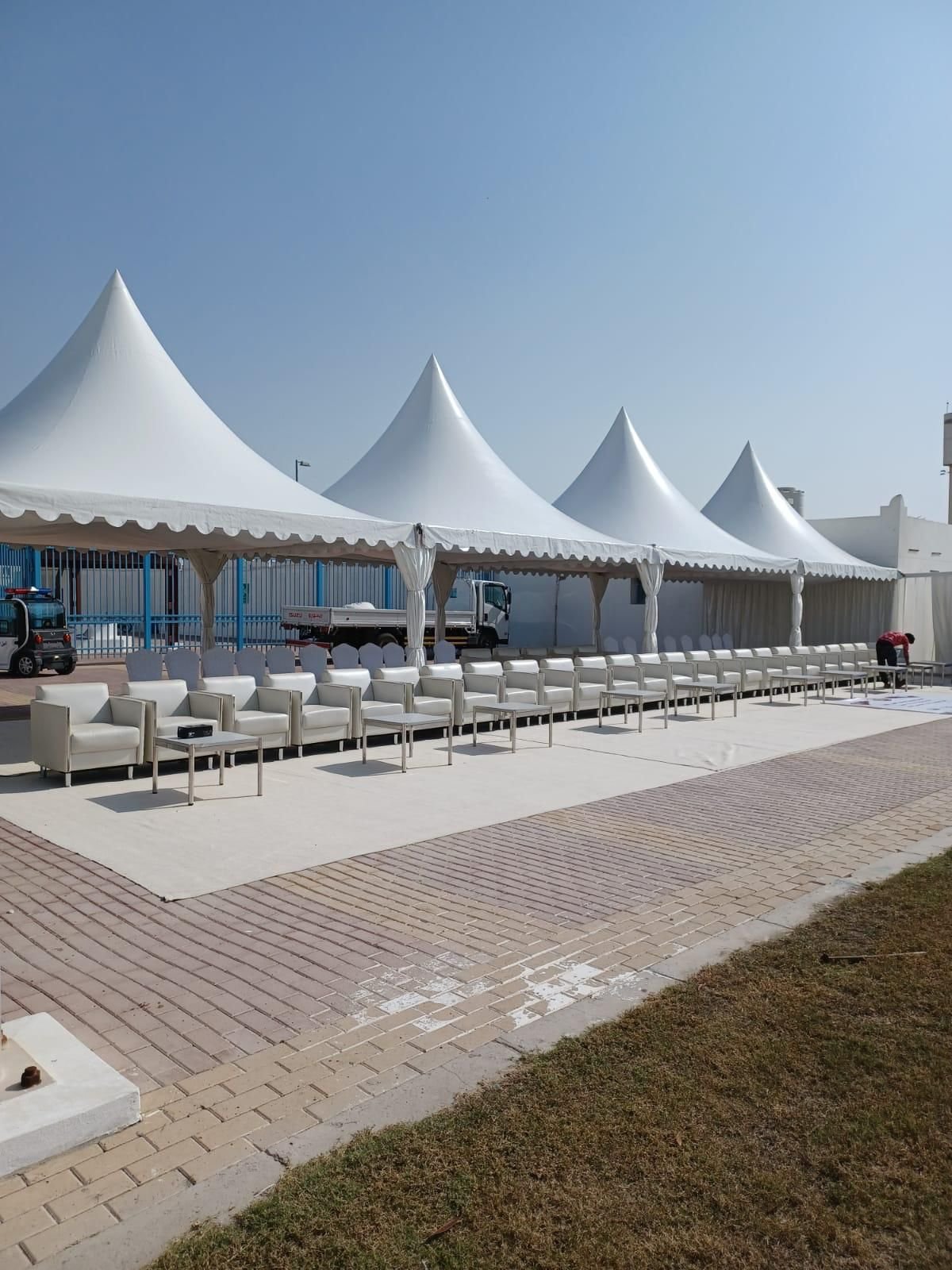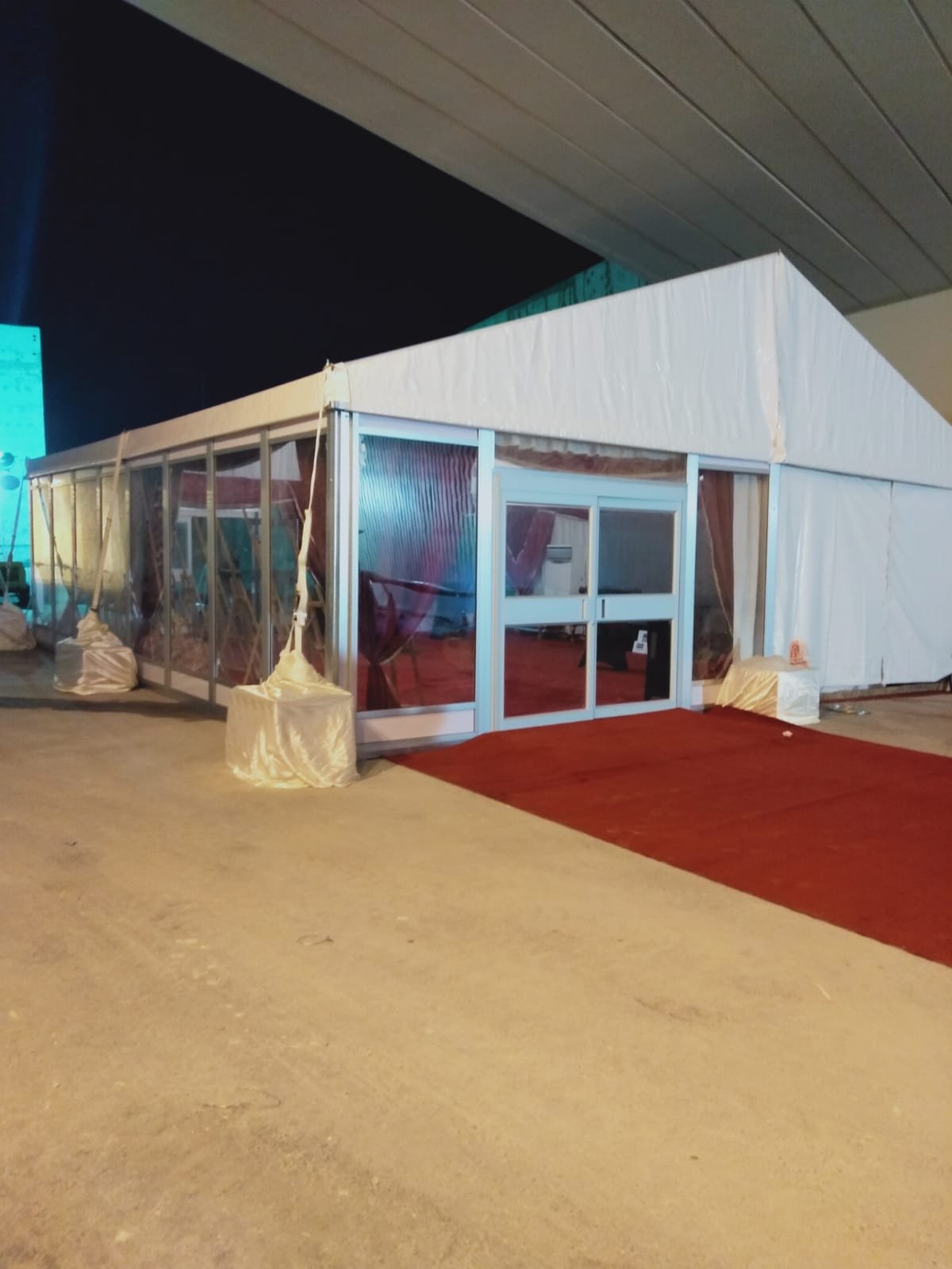 نوفر الخيام والقاعات المؤقتة مع الطاولات والكراسي وأنظمة الصوت والإضاءة.
