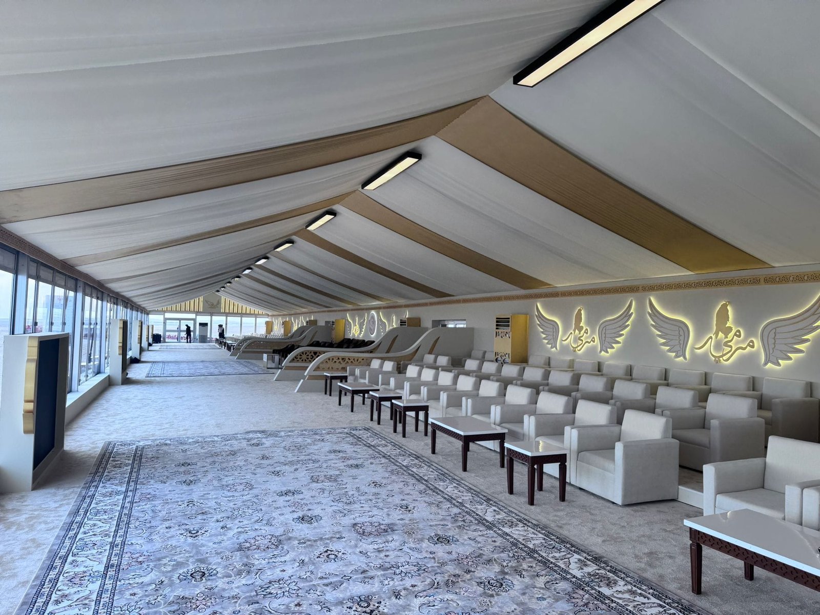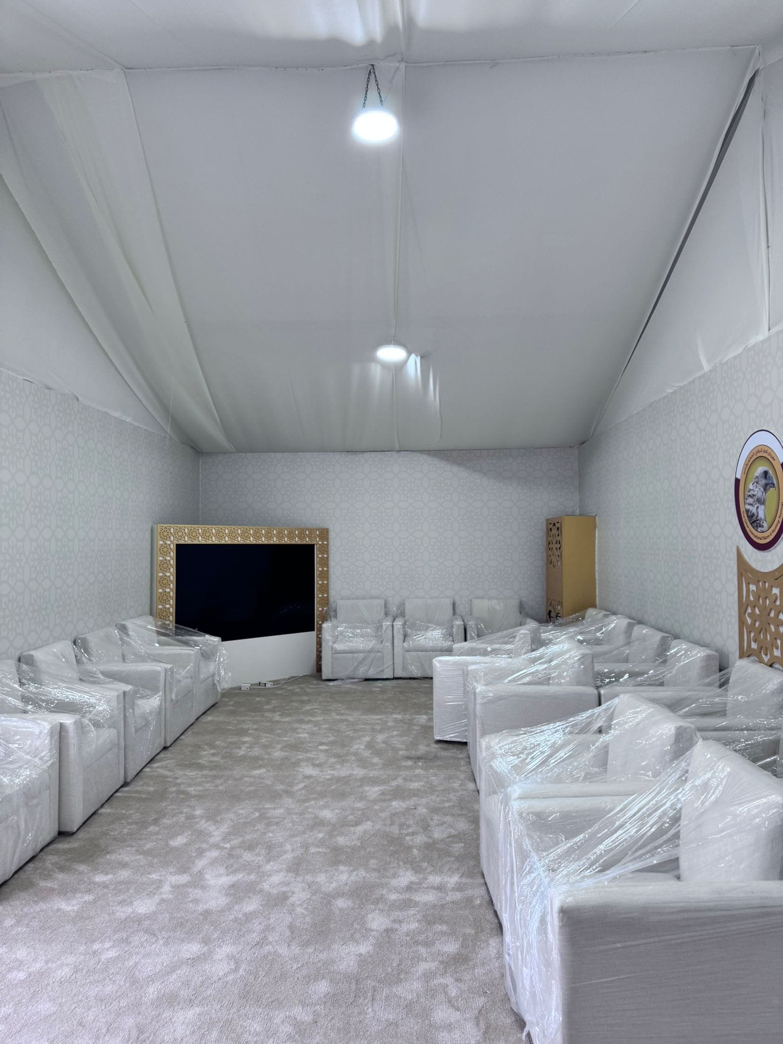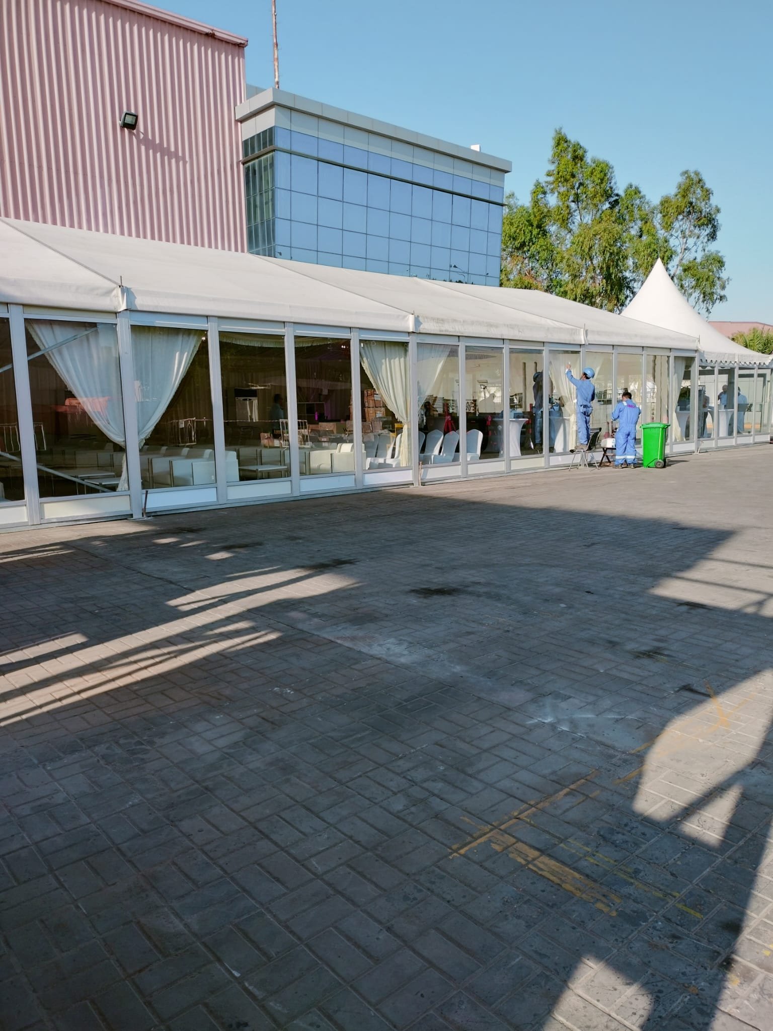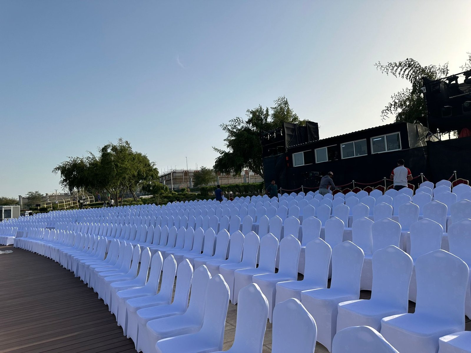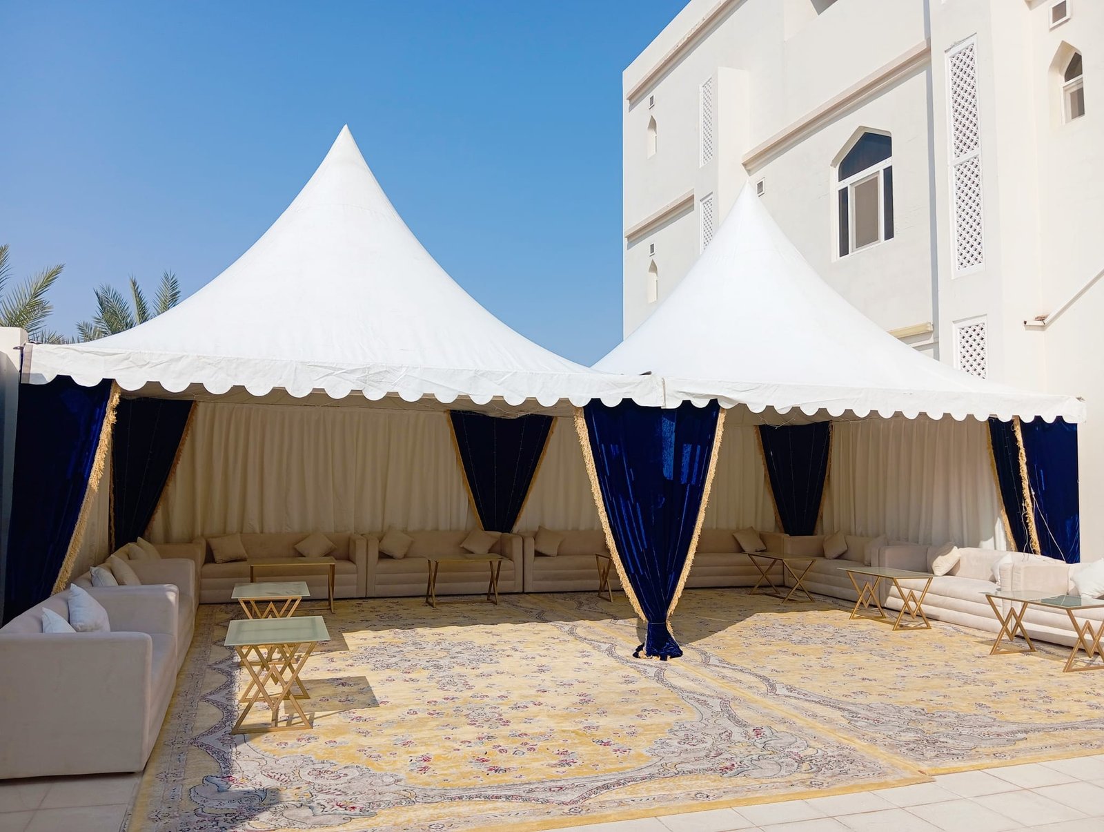 نوفر الخيام والقاعات المؤقتة مع الطاولات والكراسي وأنظمة الصوت والإضاءة.