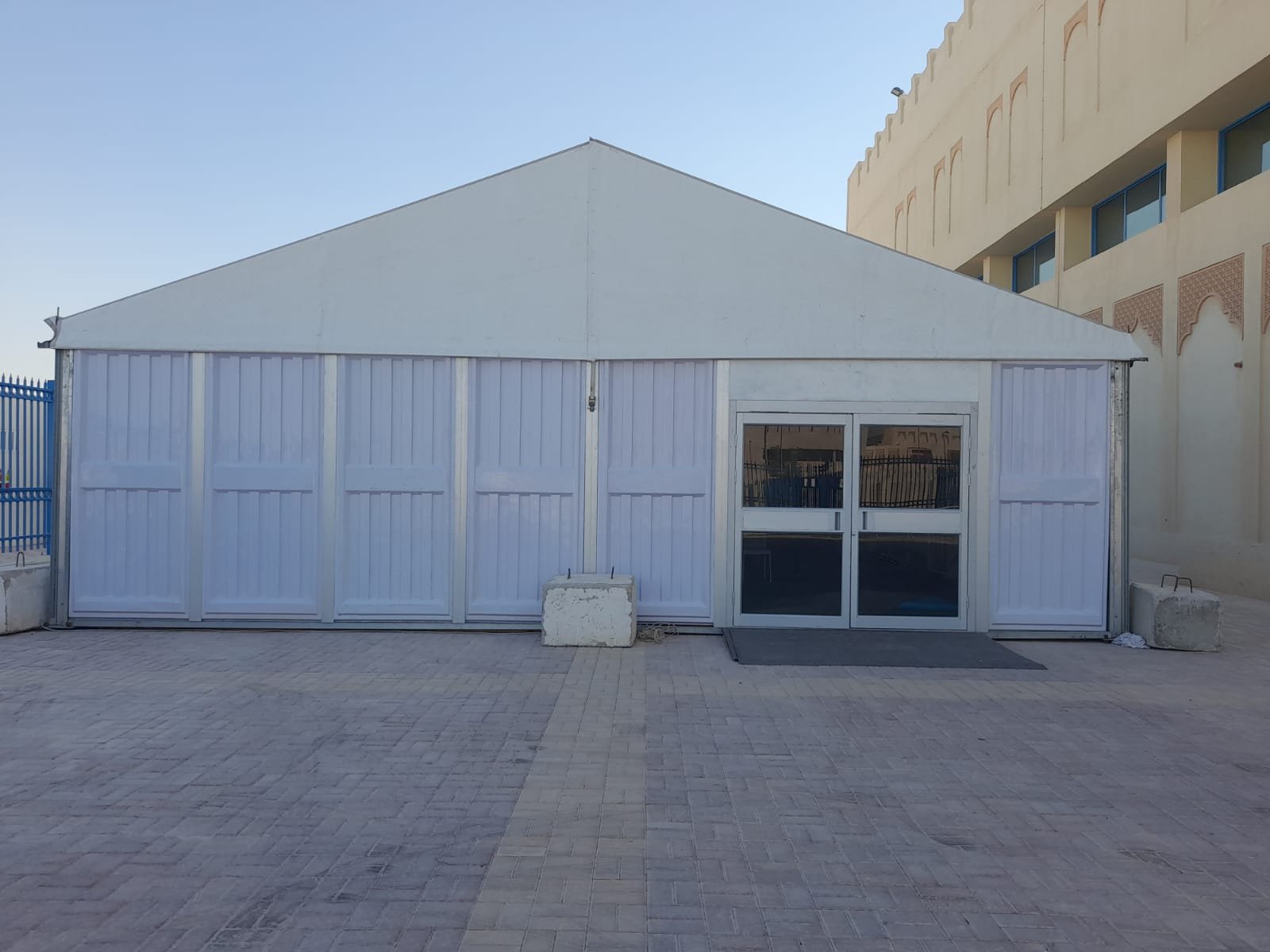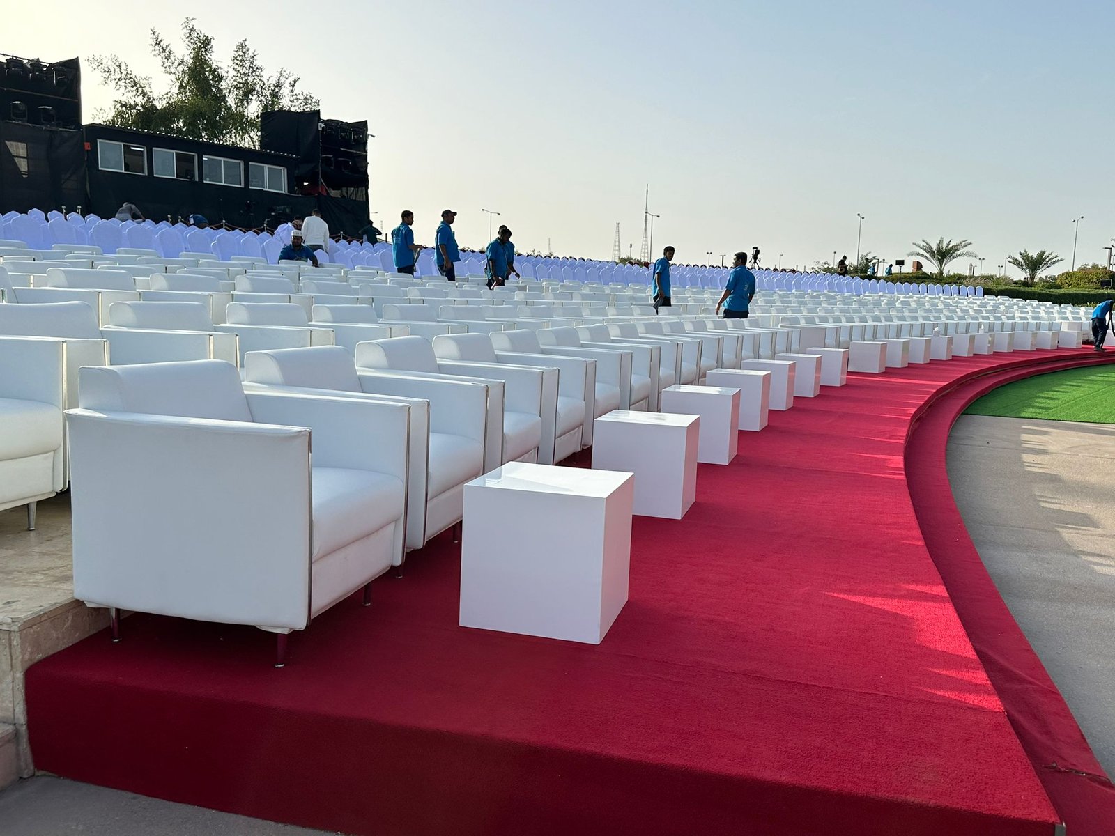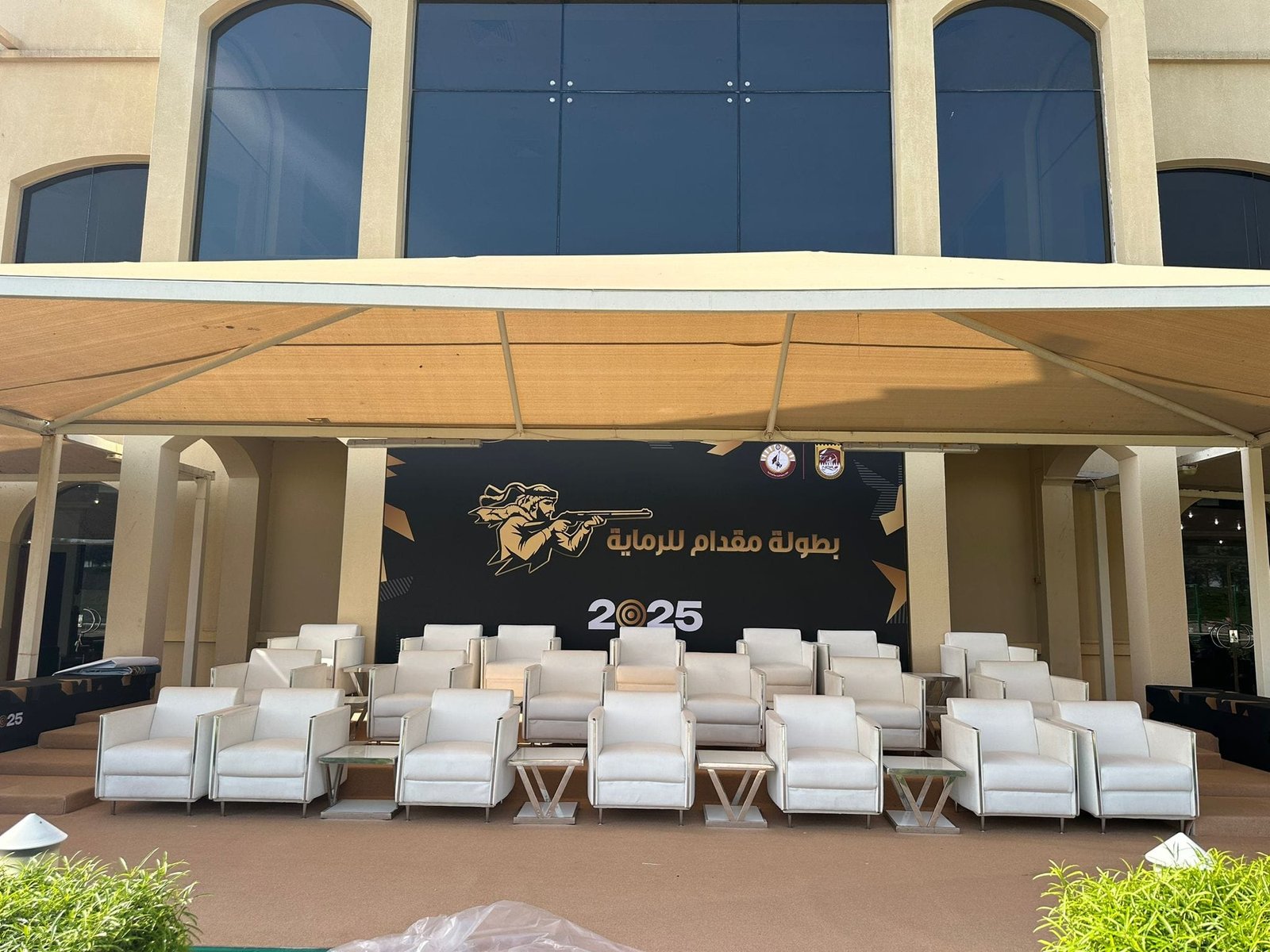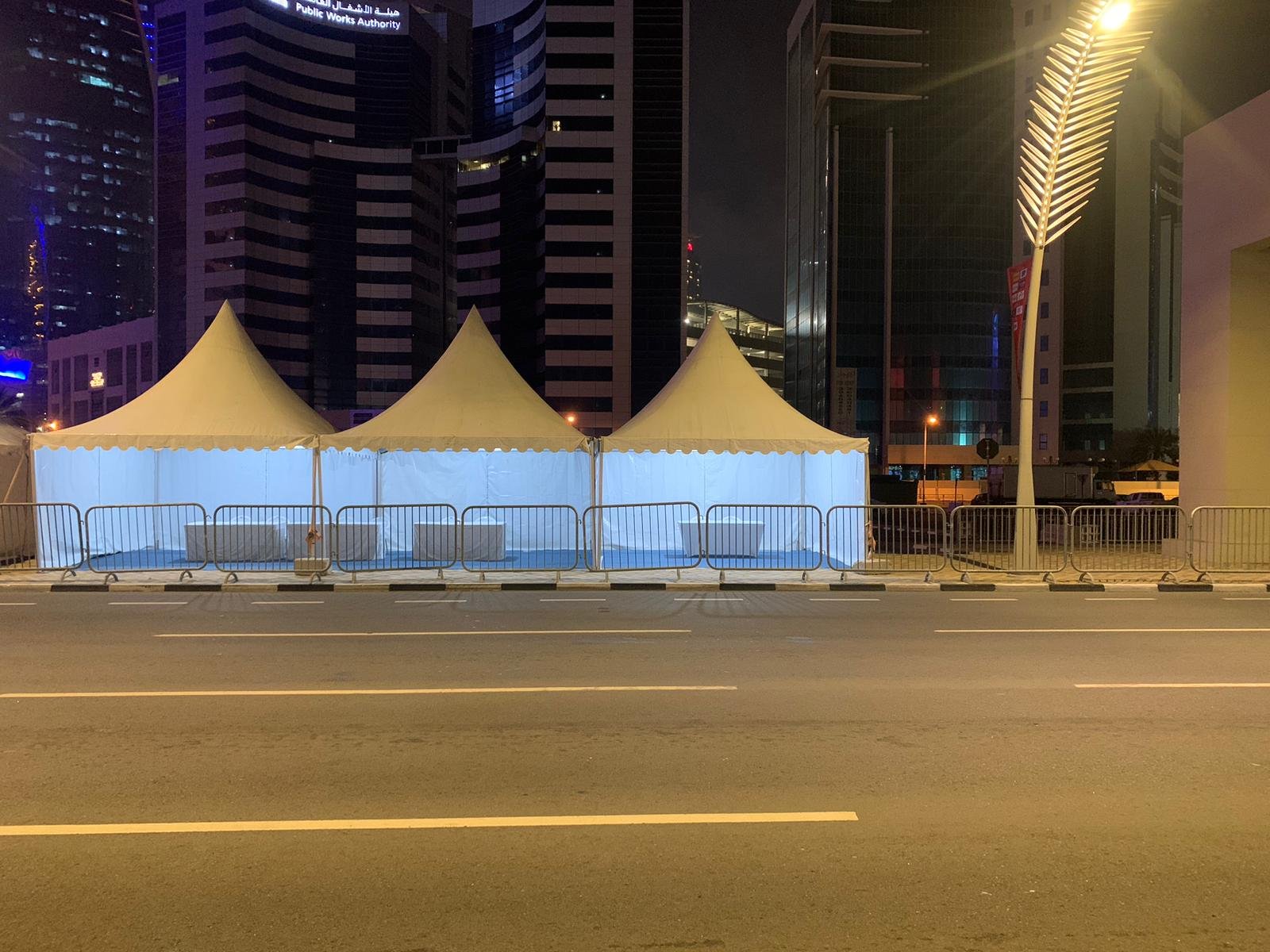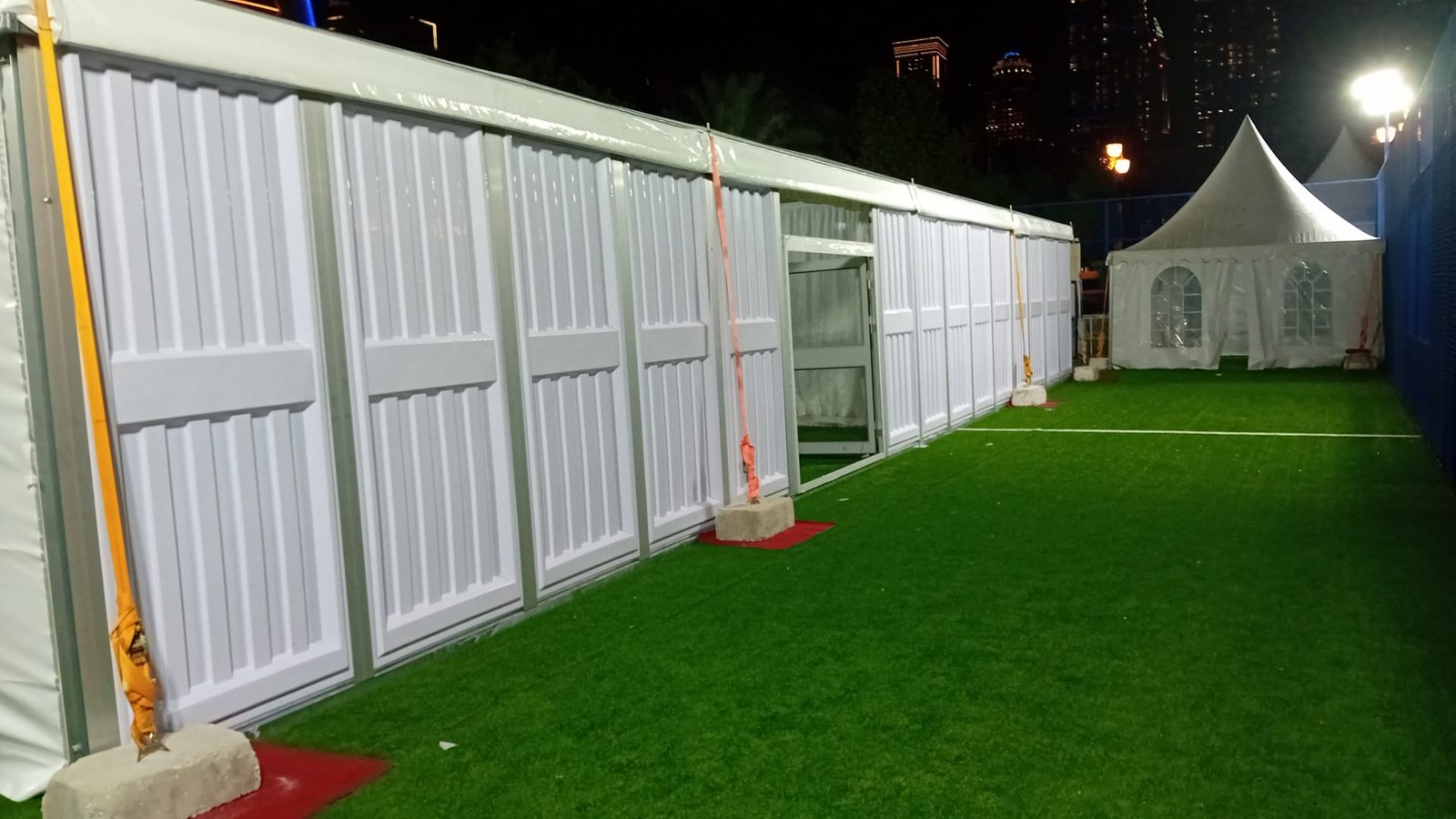 نوفر الخيام والقاعات المؤقتة مع الطاولات والكراسي وأنظمة الصوت والإضاءة.