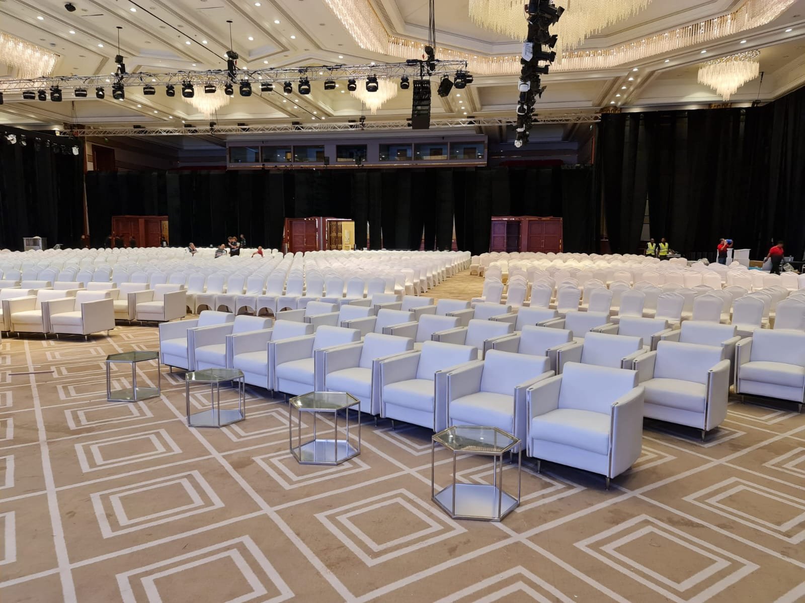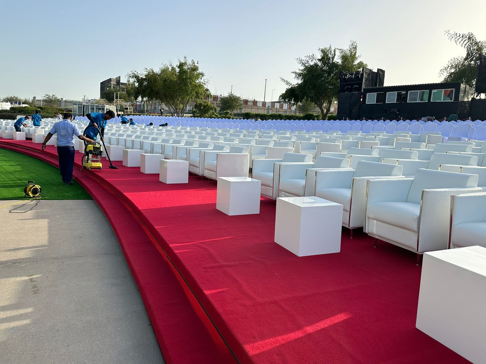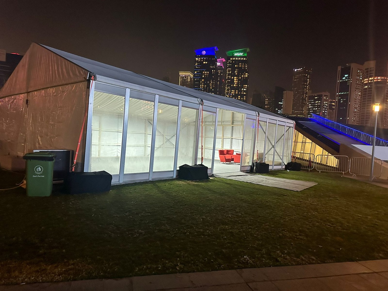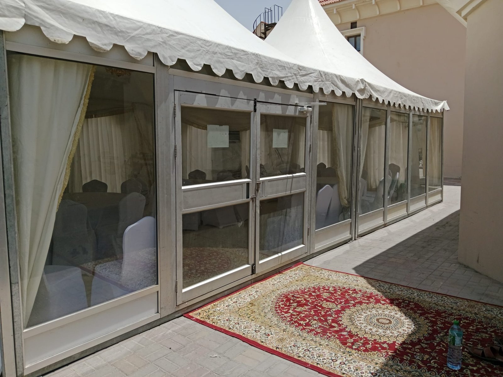 نوفر الخيام والقاعات المؤقتة مع الطاولات والكراسي وأنظمة الصوت والإضاءة.