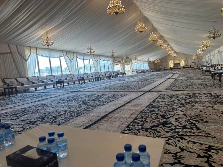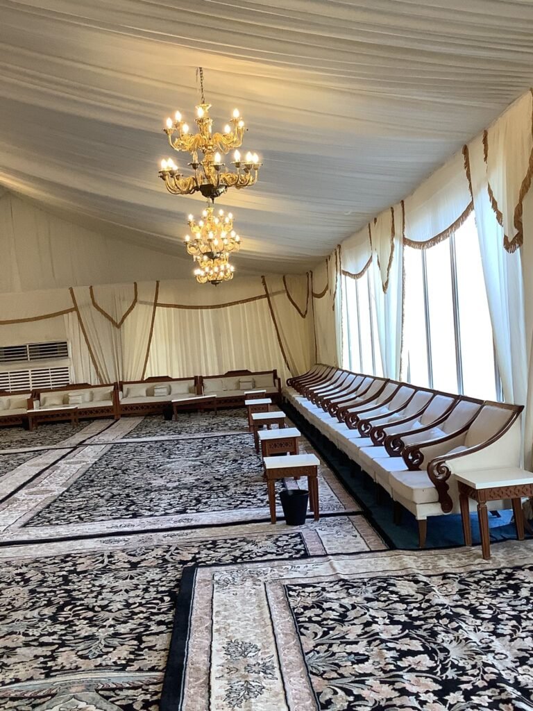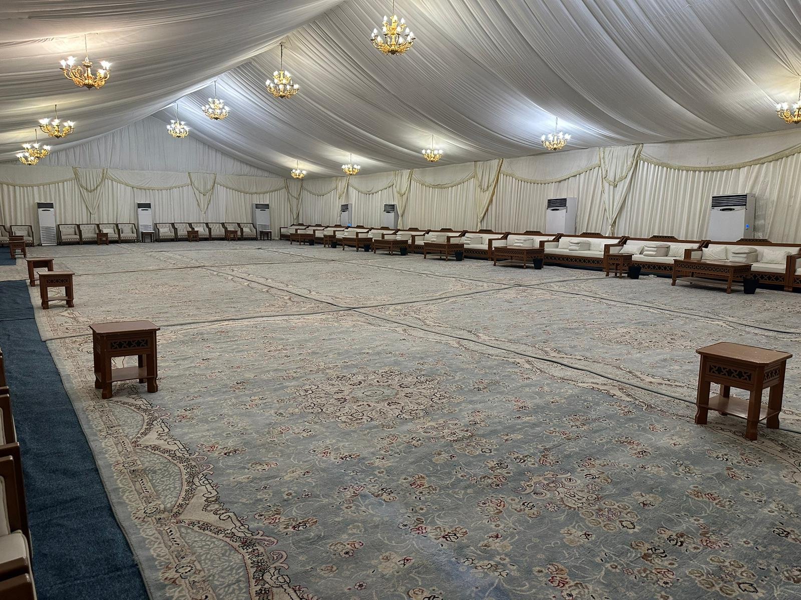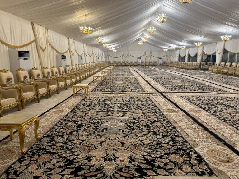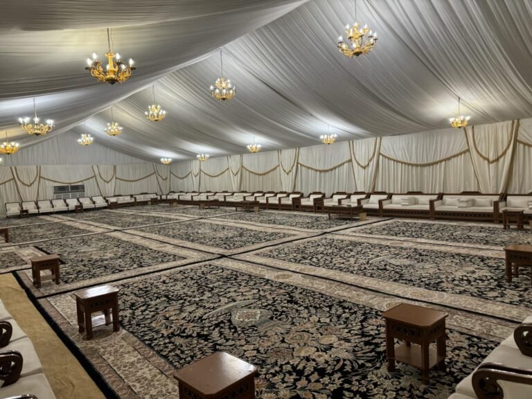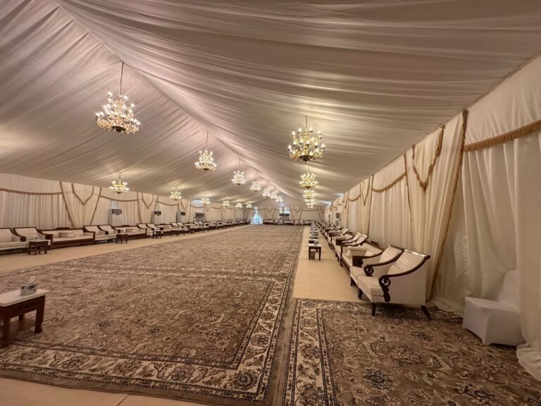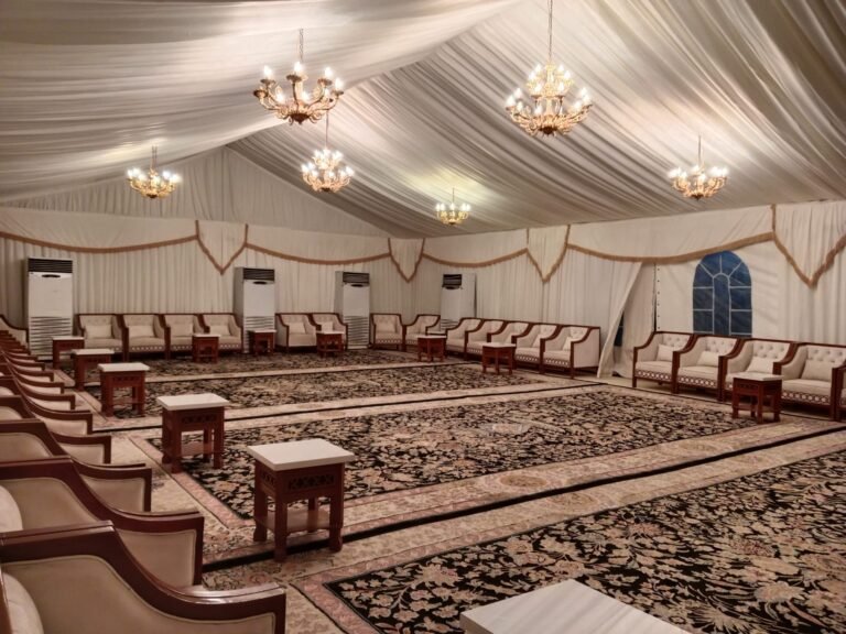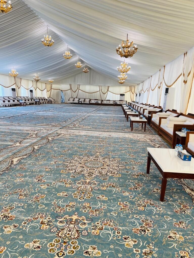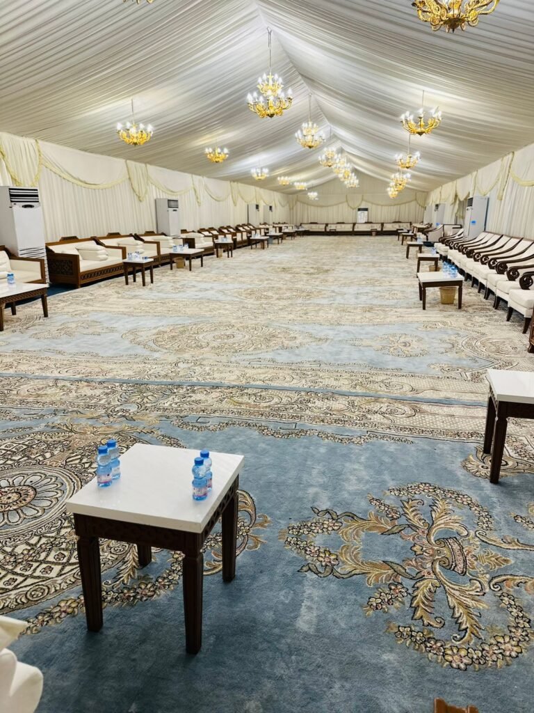 نوفر خيام عزاء ملكية بجميع المقاسات وواجها زجاج وشفاف مفروشة بمختلف أنواع الكراسي والسجاد, مع خدمات الضيافة (فاين,ماء,تمر,صابون) ,بلإضافة إلى دورة مياه ,وإستقبال الخيمة من الخارج وفرش أمام الخيمة