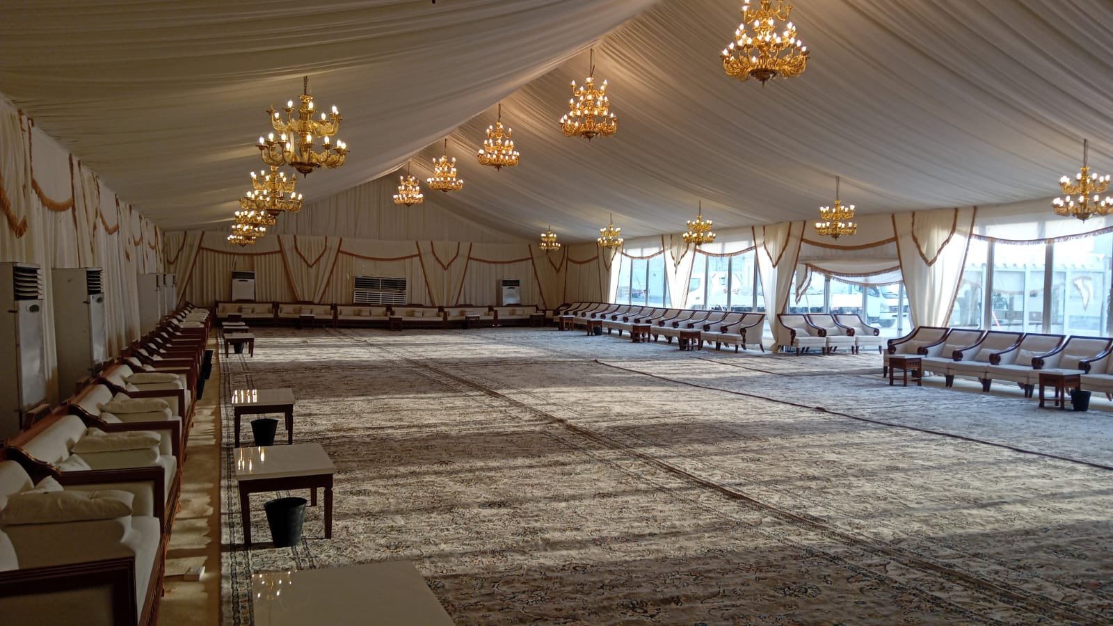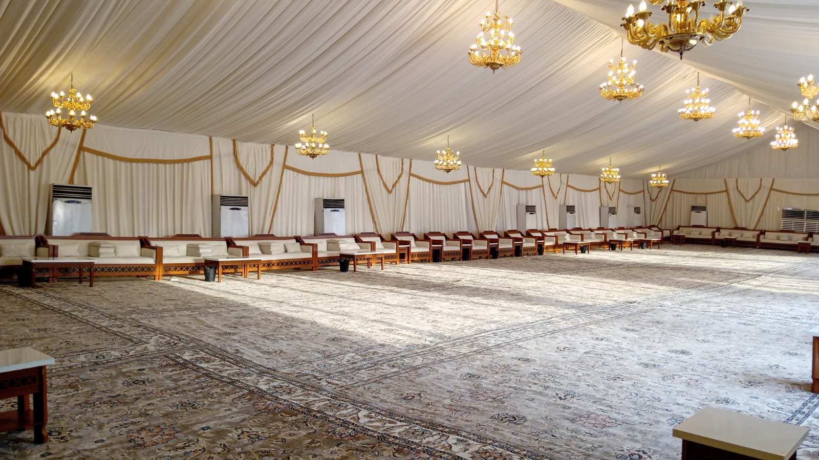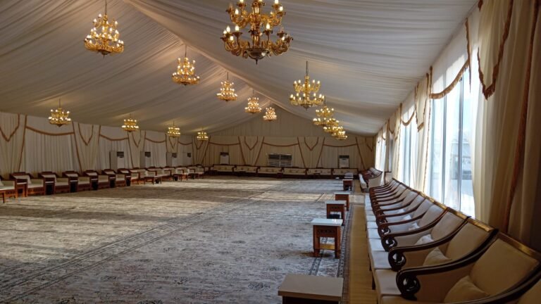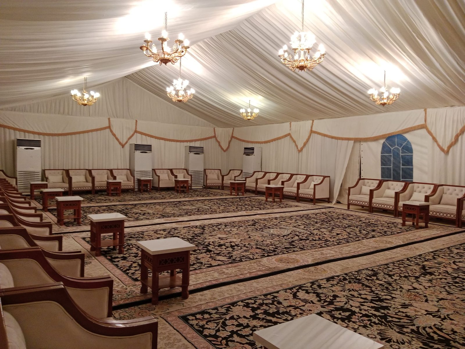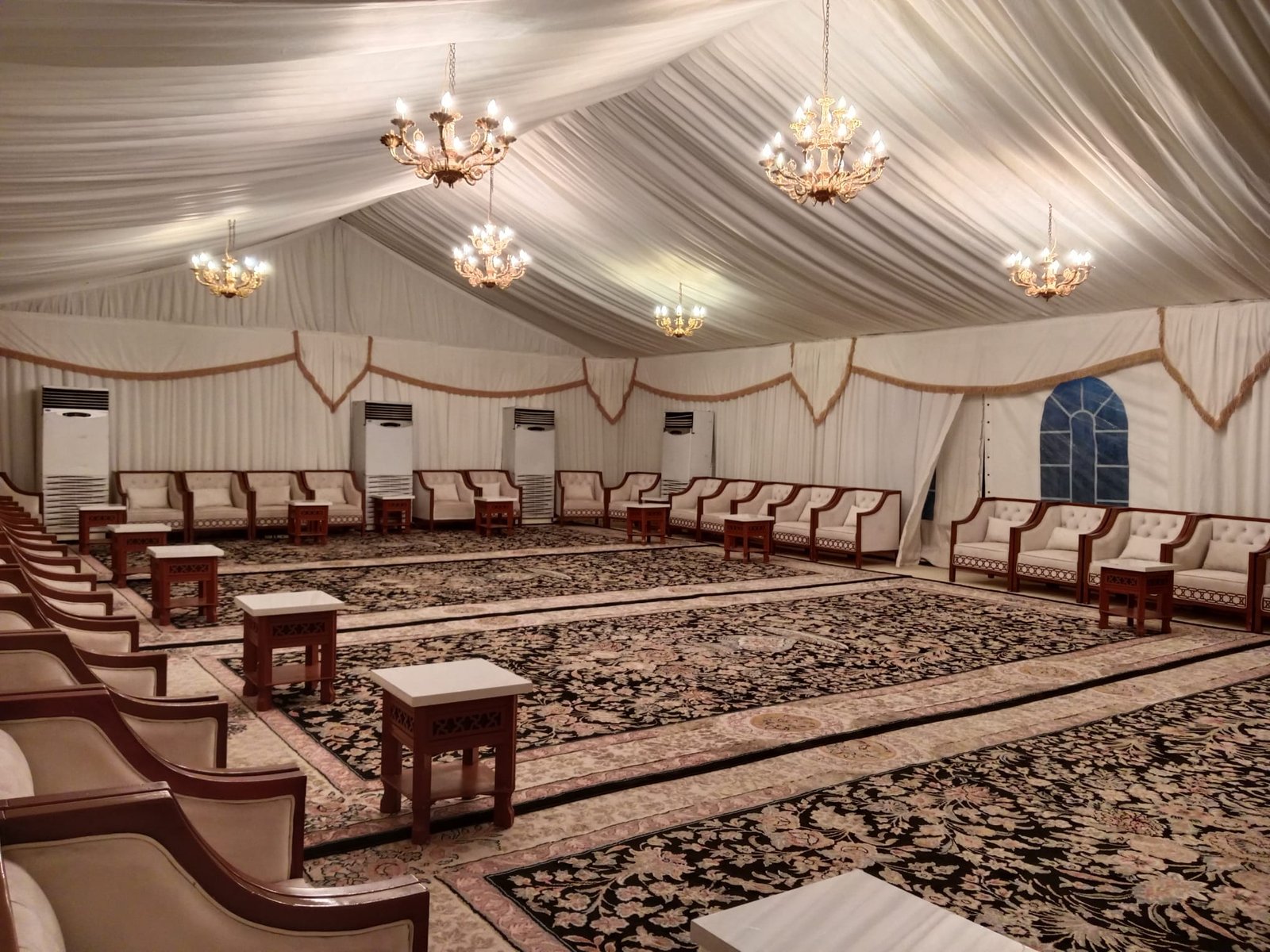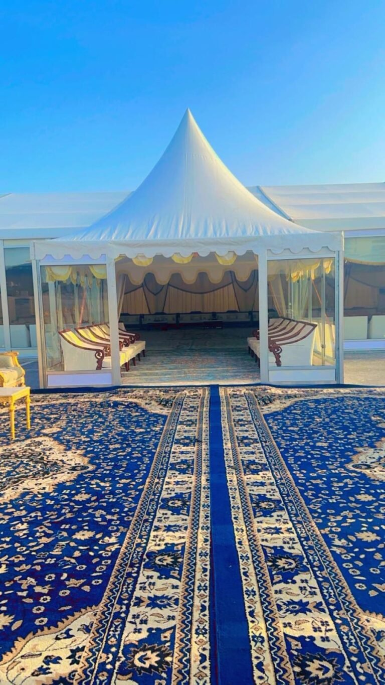 نوفر خيام عزاء ملكية بجميع المقاسات وواجها زجاج وشفاف مفروشة بمختلف أنواع الكراسي والسجاد, مع خدمات الضيافة (فاين,ماء,تمر,صابون) ,بلإضافة إلى دورة مياه ,وإستقبال الخيمة من الخارج وفرش أمام الخيمة