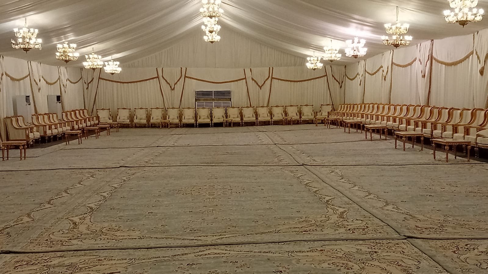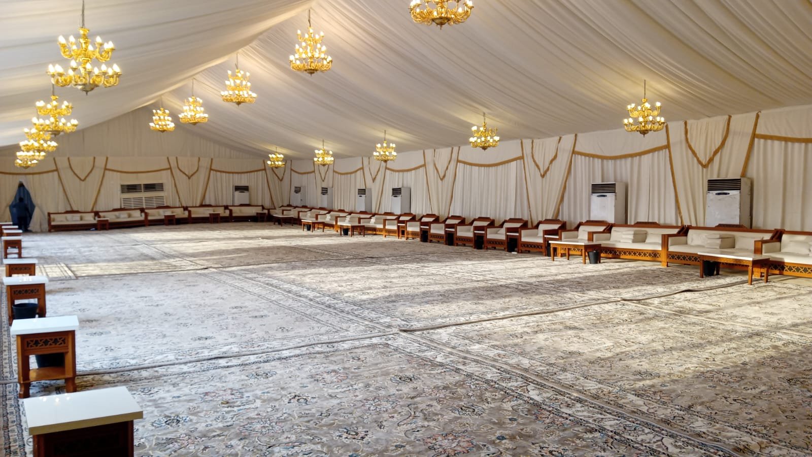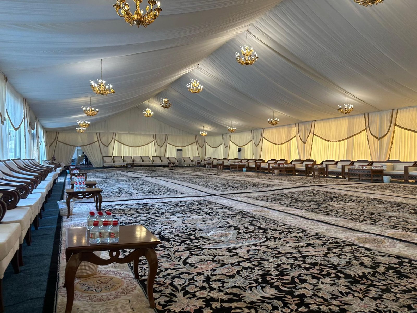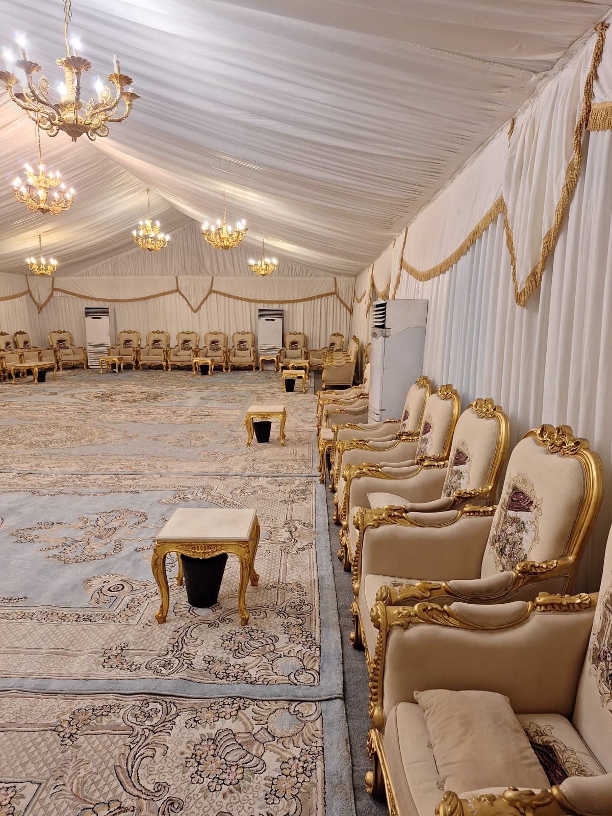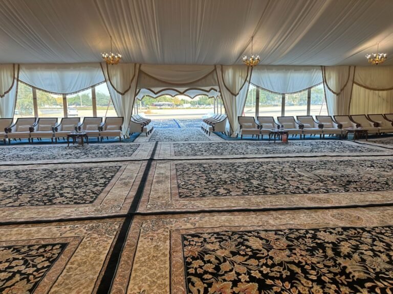 نوفر خيام عزاء ملكية بجميع المقاسات وواجها زجاج وشفاف مفروشة بمختلف أنواع الكراسي والسجاد, مع خدمات الضيافة (فاين,ماء,تمر,صابون) ,بلإضافة إلى دورة مياه ,وإستقبال الخيمة من الخارج وفرش أمام الخيمة